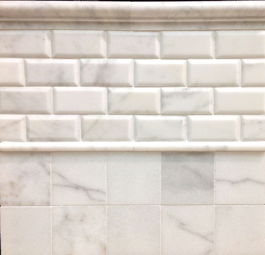 1 x 2 Basket Weave w/ Grey Marble Mosaic, 2 x 4 Beveled Brick Mosaic, 3 x 6 Beveled Field Tile, 4 x 4 Field Tile, Strips Mosaic
